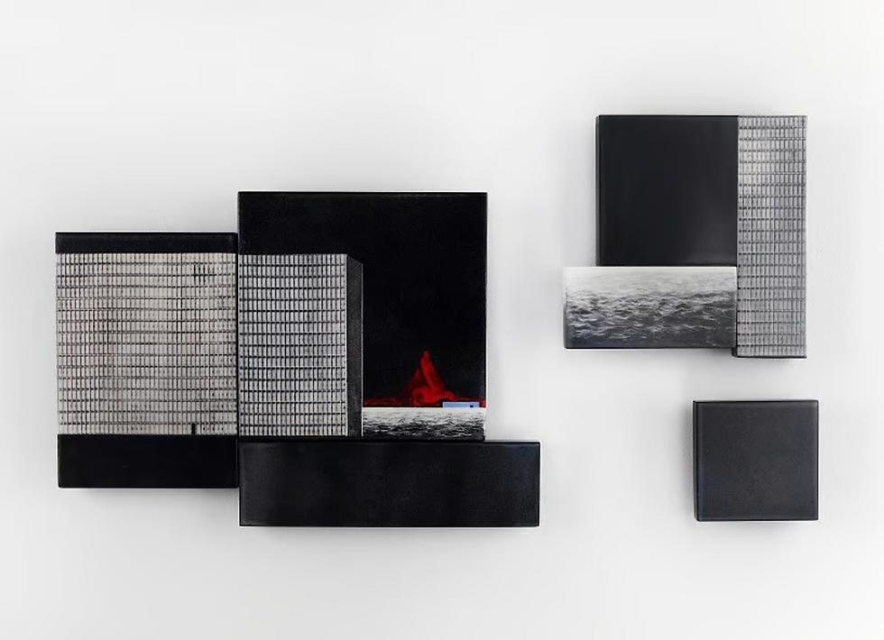 Description: In this triptych, water functions as a symbolic element drawn from recurring dreams, reflecting states of inner tension and emotional unease. The distant horizon line introduces a sense of the unknown, while the architectural forms suggest a fragile attempt to impose order on shifting psychological terrain. Created during the pandemic, the work captures a universal experience of uncertainty and vulnerability—conditions that continue to resonate today. Through restrained forms and subtle chromatic transitions, the triptych invites contemplation of fear, instability, and the delicate structures we build to navigate change.
